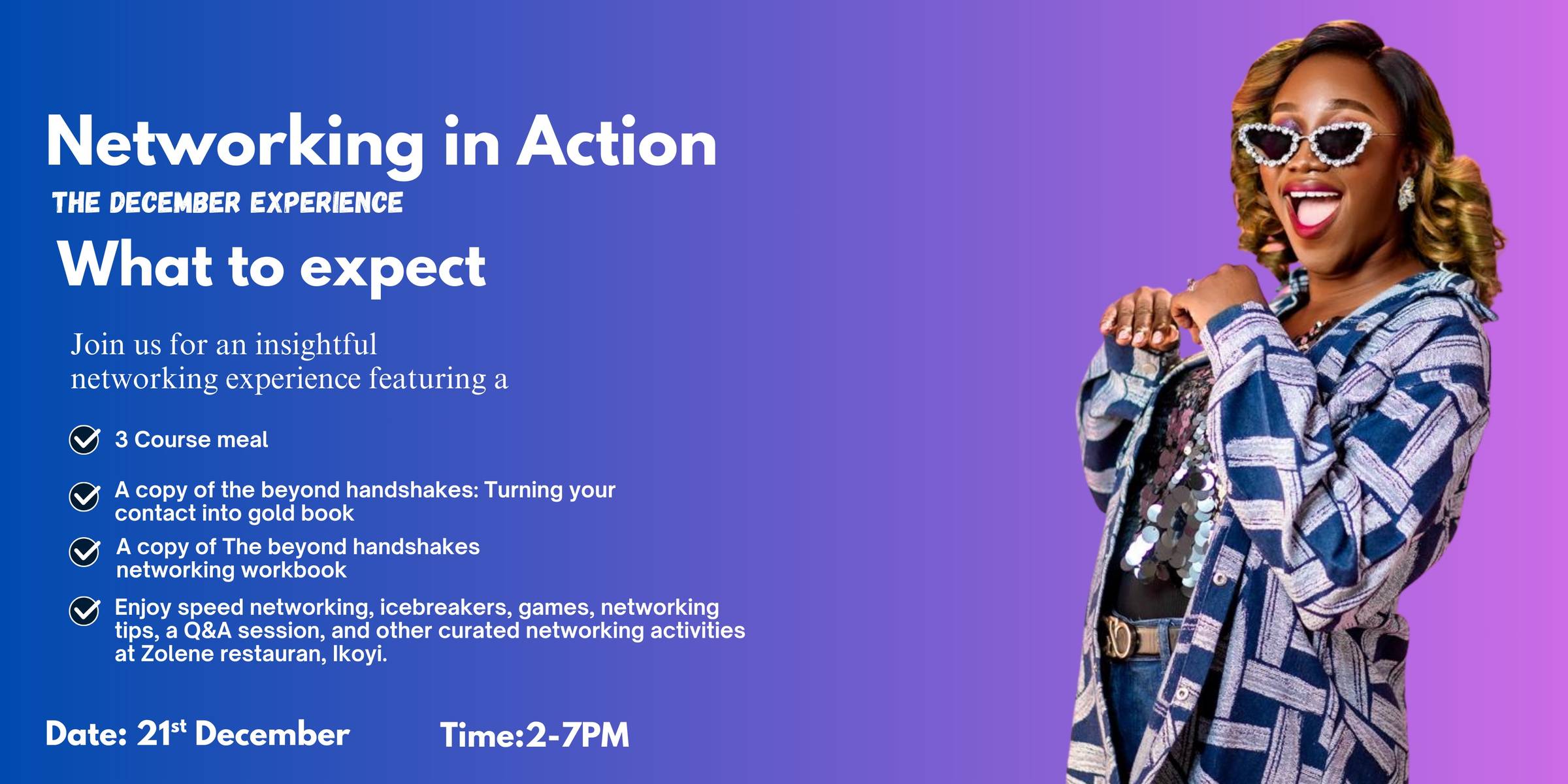 I am excited to invite you to the Networking In Action (NIA) with Toyin Asada - December Experience! After the wonderful connections and energy at our flagship event in September , we decided to create another space this December to learn, connect, and enjoy time together.